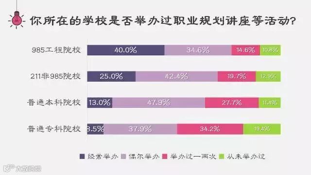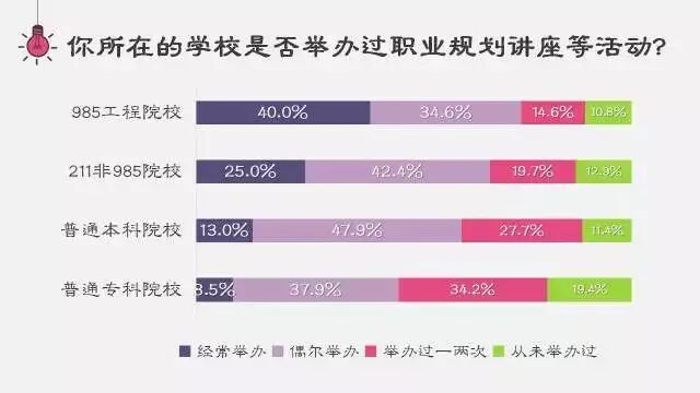 水平越高的大学越经常举办职业规划方面的讲座活动,而普通本科高校同学的类似活动远远不能满足同学们的需求。