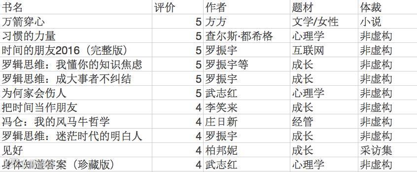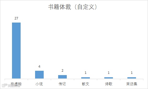 我按照自己的方式分了体裁,当然体裁怎么分有很多种说法,小时候上语文课是按照“诗歌/散文/小说”分的,但是都是在文学范畴。作为一个文科生,上大学的时候当然也是很喜欢看这些的,可是工作之后,发现已经不得不越来越依赖这些非虚构的书,带给我更多的方法论了。至于其他的体裁,也就是蜻蜓点水,在自己读非虚构类书之后消遣一下。