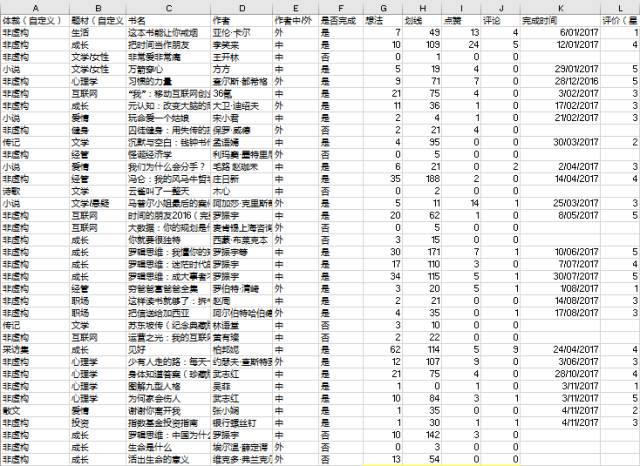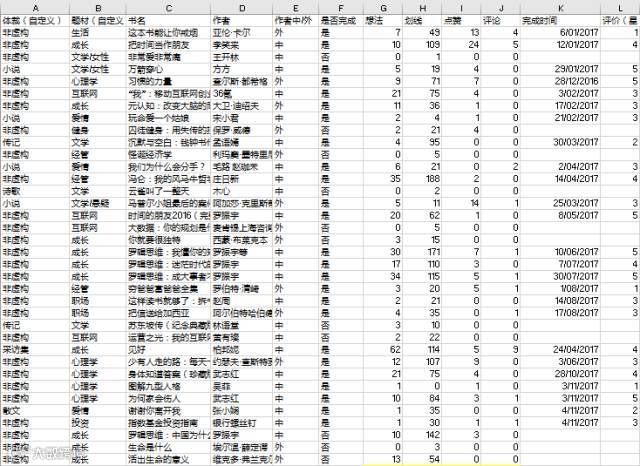 G-J列:很喜欢“微信读书”的原因有几个,其中一个就是可以直接划线、写想法,还可以和别人进行阅读社交,也会收到别人的点赞和评论。所以这部分数据我也记录下来了。这里还想多说一点,类似微信读书这种带有社交属性的APP好玩的点就在于人与人之间的关系得以建立,我想要读一些和自己行业相关的书,基本上看看自己的老板和同事在读什么,就知道哪些书好,哪些书应该放在高优先级了,为我选书省去了很多时间。