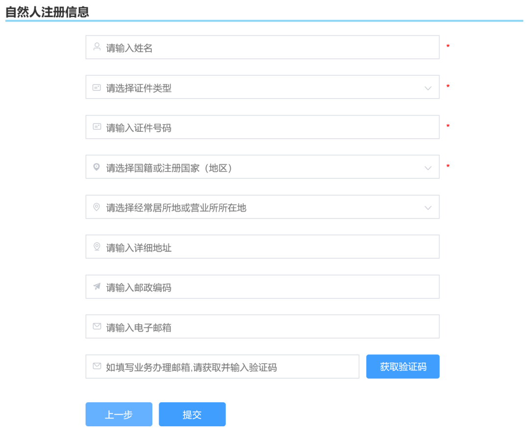 (2)填写自然人信息,其中证件类型如选择居民身份证,还需填写身份证有效期,以上信息填写完成提交后即完成注册。