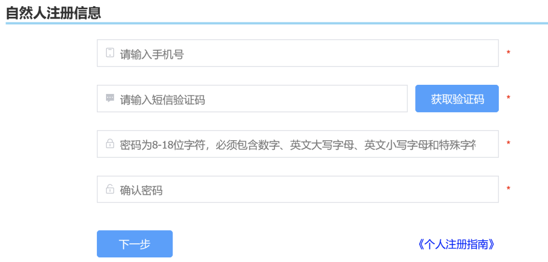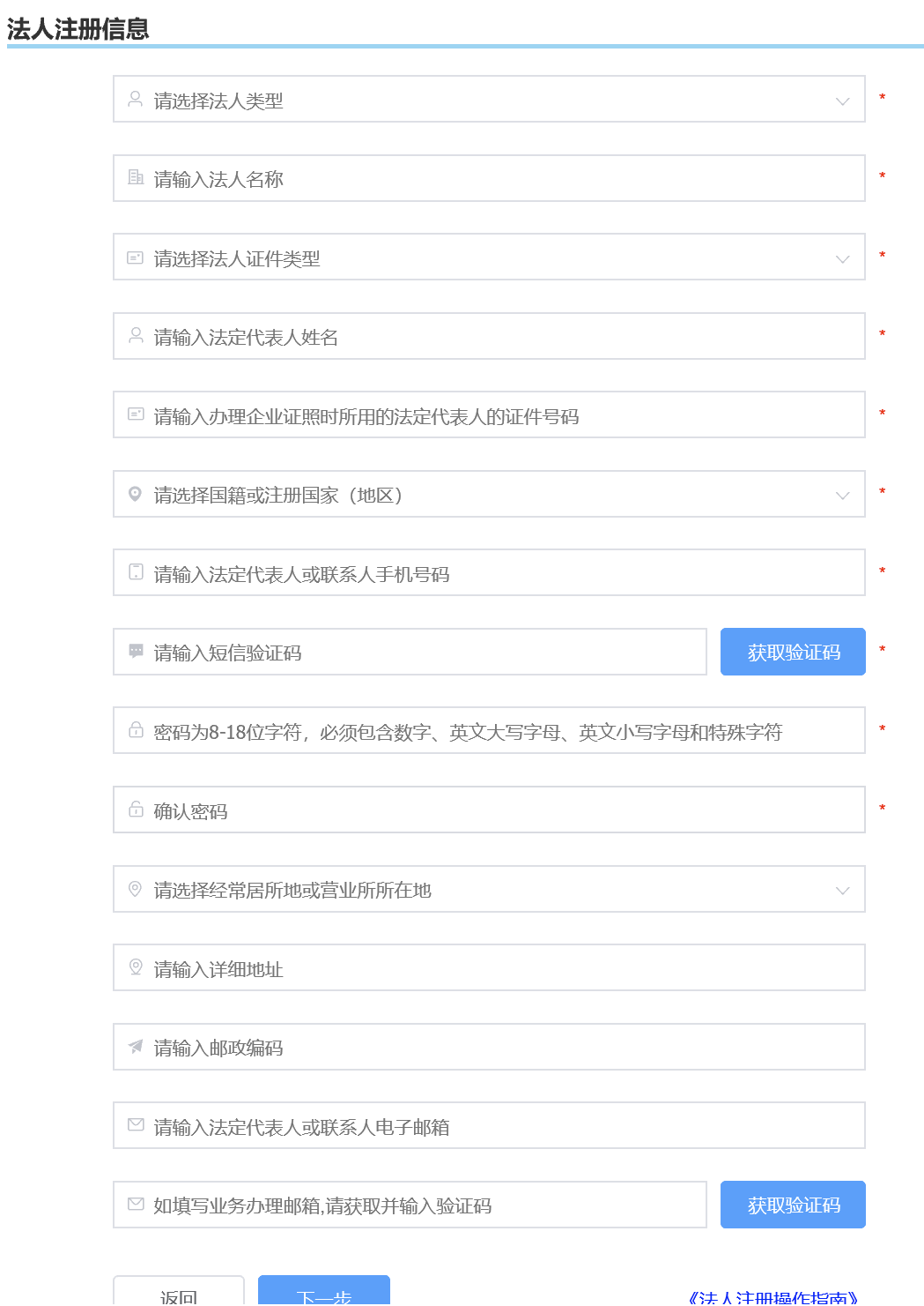 法人单位:公司名称,统一社会信用代码,法人姓名,法人身份证号,经办人手机号,验证码(如经办人无个人账号需多提供经办人姓名,经办人身份证号)