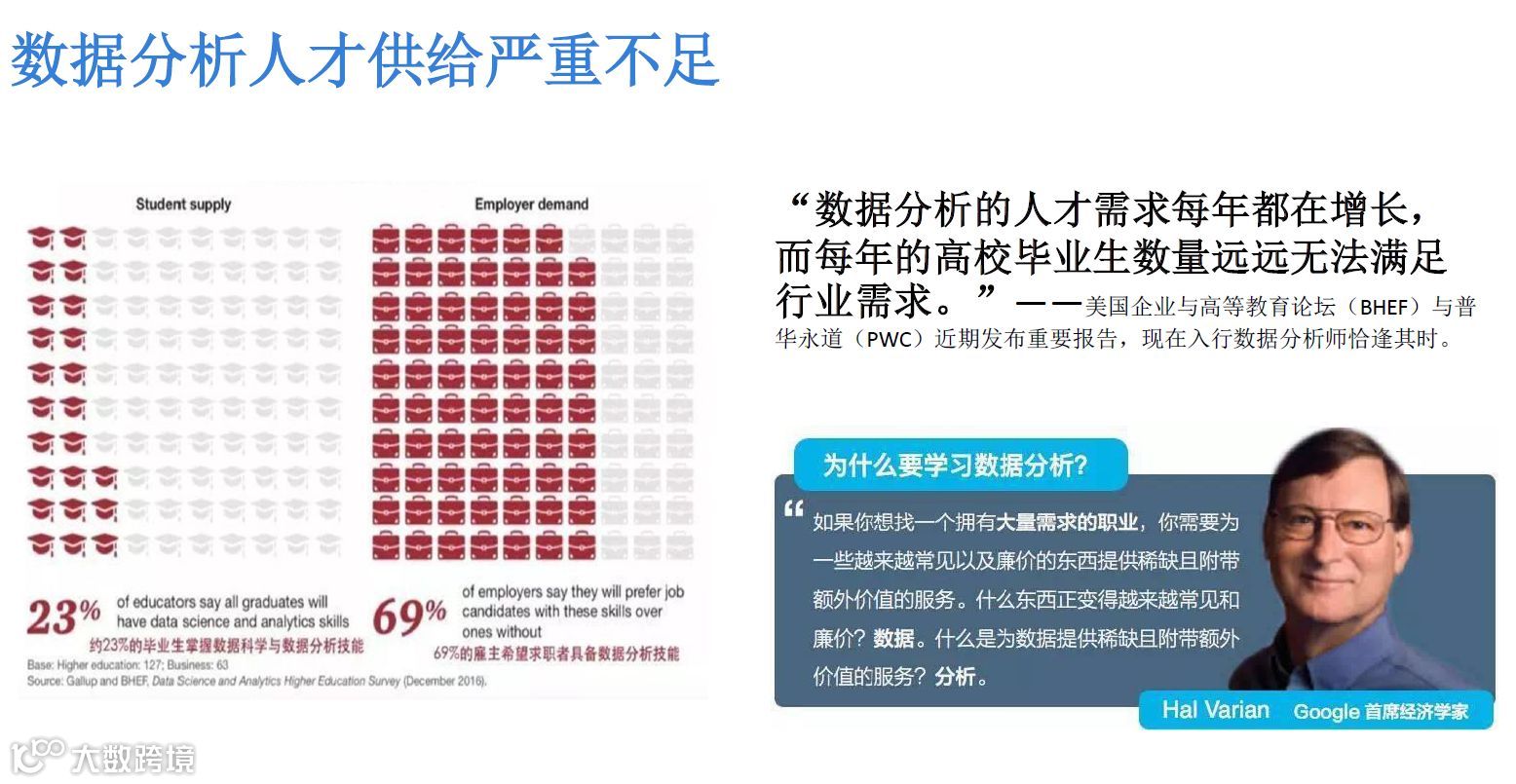 在人才需求方面,他说“数据分析的人才需求每年都在增长,而每年的高校毕业生数量远远无法满足行业需求,数据分析人才供求比超过了1:3,相当于3个职位竞争一个求职者”。