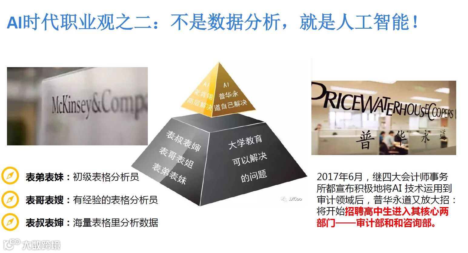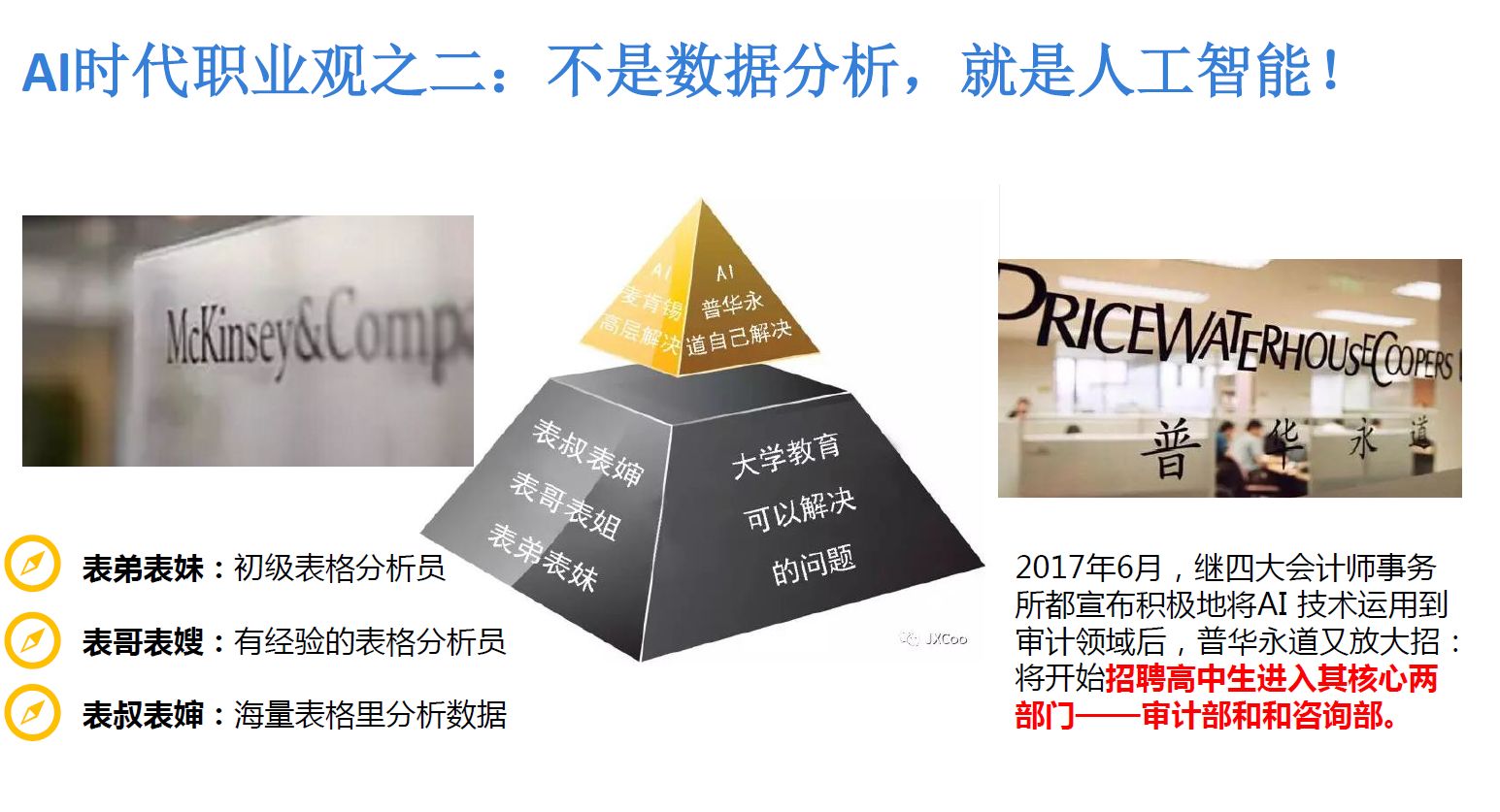 他认为人工智能时代职业观“首先是要关注新的行业机会,积极拥抱大数据和人工智能,在一些特定行业甚至会出现不是数据分析就是人工智能的职位情况;其次是要做一个终身学习者,不断更新自己的知识储备"。