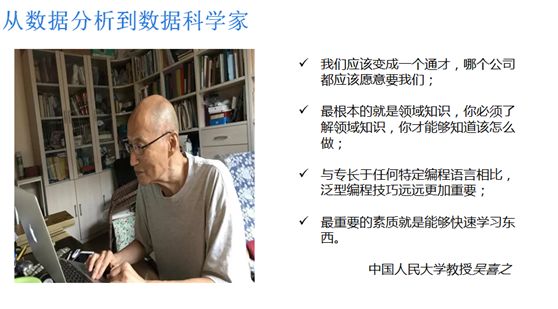 最后他用吴喜之老先生的故事激励大家跨界学习、了解领域知识和掌握泛编程技巧。他鼓励大家”数据科学家不是一天养成的,但只要心生向往,什么时候学习都不晚”。