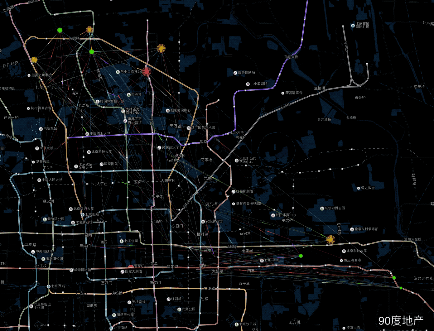 (图中黑色字体顺时针方向依次为:霄云路、五道口、安贞桥、永安里、建国门、东大桥、四惠、燕莎、双井、亚运村、大望路、金融街、朝阳门、国贸、望京、西三旗、西二旗、中关村、上地。)