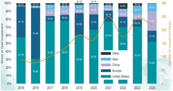 全球投融资格局正在发生变化。2024年,美国商业航天企业获得投融资40亿美元,同比减少13亿美元;而中国企业融资额从5.42亿美元增长至19亿美元,全球占比达到24%。