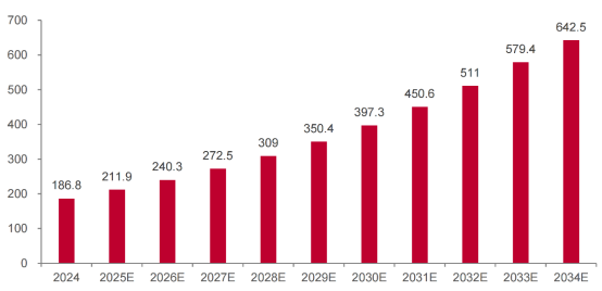 根据Precedence Research的报告,2024年全球发射服务市场收入约186.8亿美元,预计到2034年将增长至642.5亿美元,年复合增长率达13.15%。