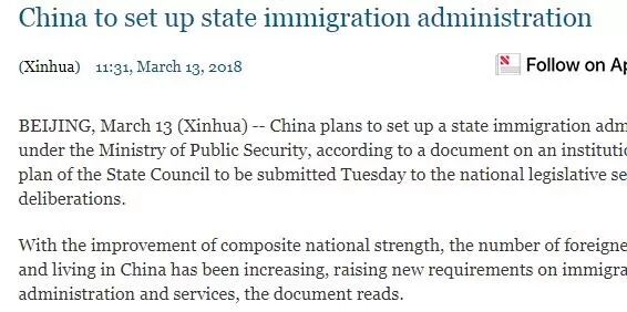 正在北京举行的十三届全国人大一次会议上,由国务院提交的机构改革方案中,提出组建国家移民管理局,负责外国人居留、国籍管理和难民管理等问题。