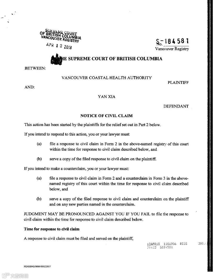 温哥华沿岸卫生局(Vancouver Coastal Health,VCH)正在通过法律手段向这名产妇追债。