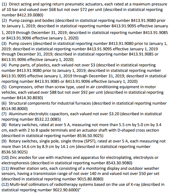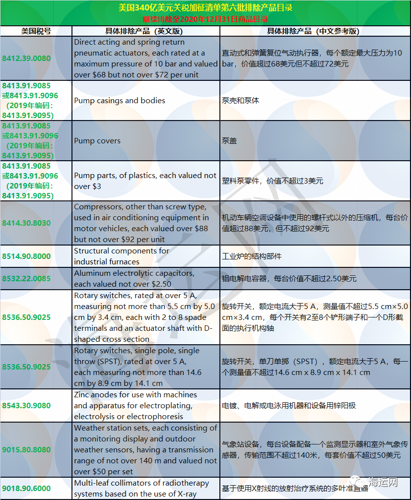 此次获得有效期延长至2020年12月31日的共涉及9个税号12个品项商品。具体如下: