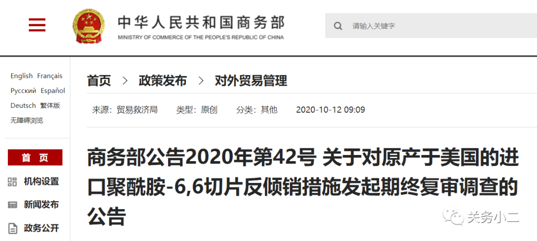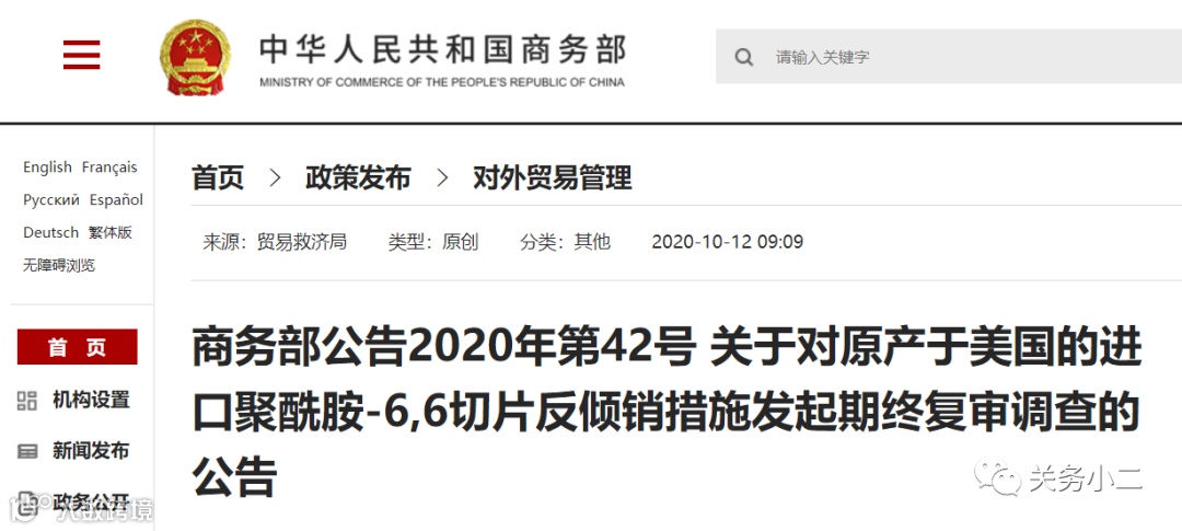 商务部公告2020年第42号 关于对原产于美国的进口聚酰胺-6,6切片反倾销措施发起期终复审调查的公告