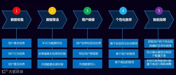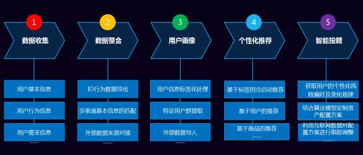 智能投顾的流程:用户画像(主观画像+客观画像),确定投资者类型,输出理财方案,针对理财方案,提出预期提示。