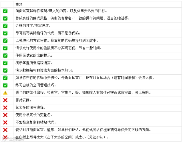 这是关于技术面试要做和不要做的一个列表,主要用于算法面试。其中一些可能只适用于白板面试或电话交流,但大多数两者都适用。每次面试前我都会温习这个清单,提醒自己,并最终把所有这些都消化到我不再需要依赖的地步。