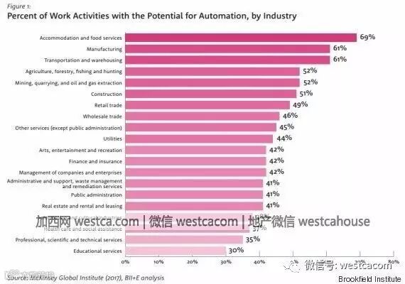 加拿大的食品服务和住宿的工作被自动化取代的风险最大,其中这些领域69%的工作将被机器取代。