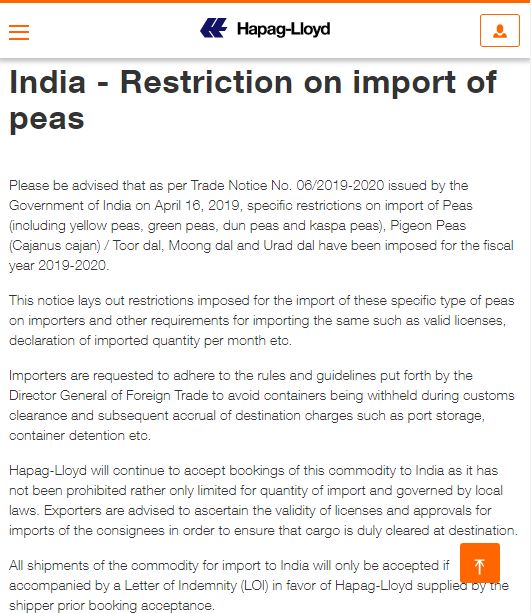 印度政府于2019年4月16日发布第06 / 2019-2020号贸易通知,要求进口商在进口豌豆(包括黄豌豆,绿豌豆,豌豆和卡斯帕豌豆)的时候,提供有效许可证、申报每月进口数量等。如果违反规定,可能会发生集装箱遭扣留等处罚!