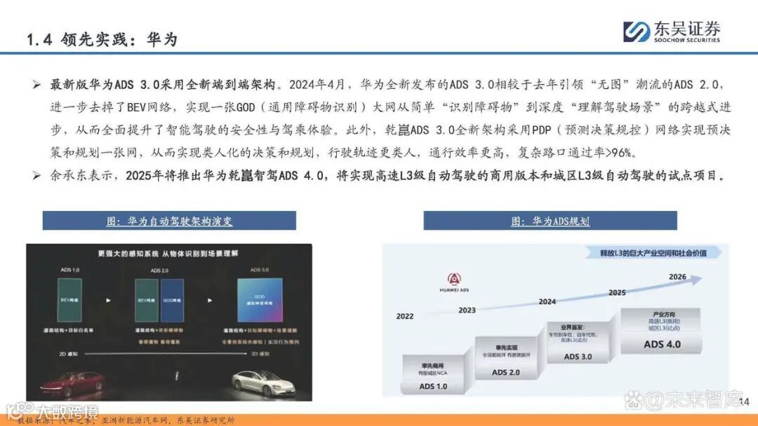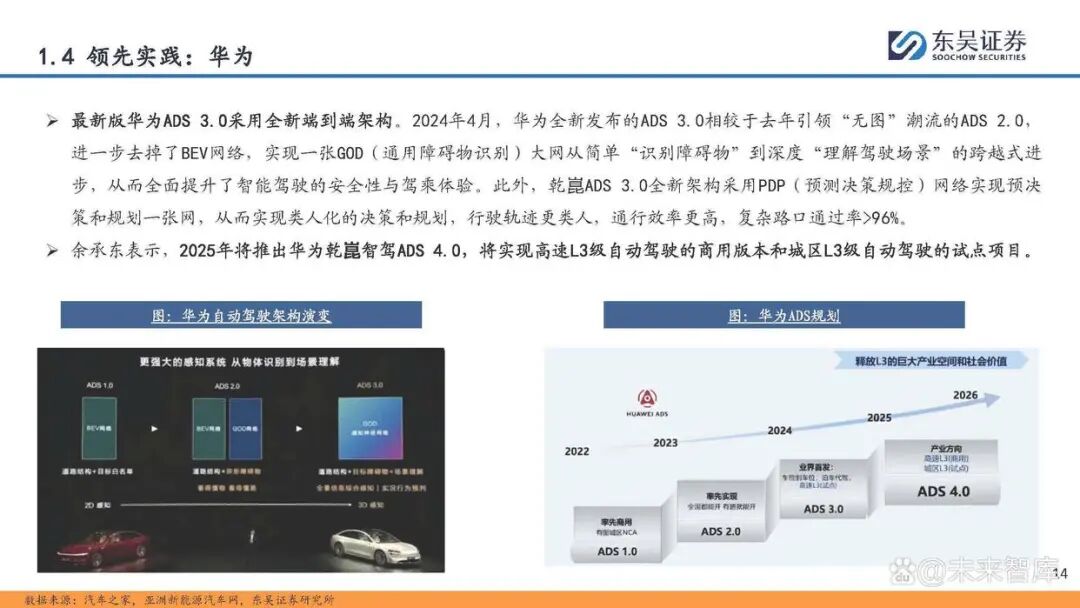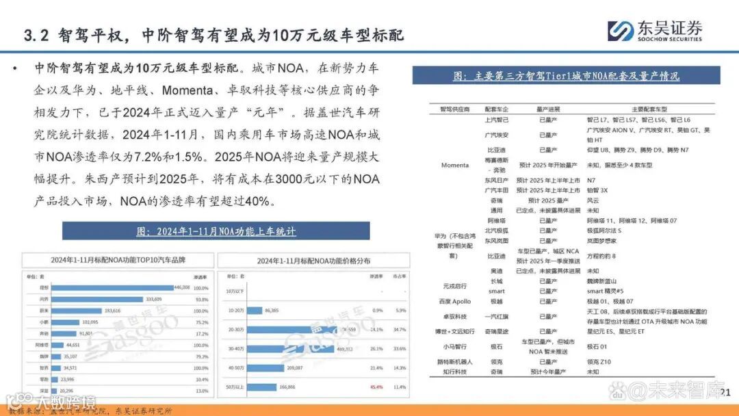 中阶智驾有望成为10万元级车型标配。城市NOA,在新势力车 企以及华为、地平线、Momenta、卓驭科技等核心供应商的争 相发力下,已于2024年正式迈入量产“元年”。据盖世汽车研 究院统计数据,2024年1-11月,国内乘用车市场高速NOA和城 市NOA渗透率仅为7.2%和1.5%。2025年NOA将迎来量产规模大 幅提升。朱西产预计到2025年,将有成本在3000元以下的NOA 产品投入市场,NOA的渗透率有望超过40%。