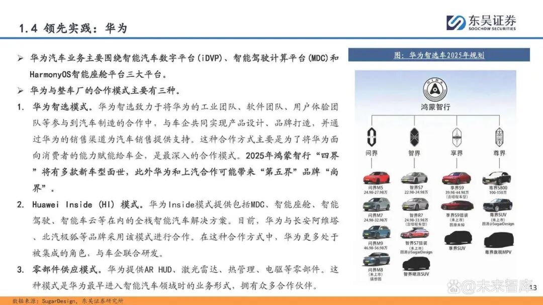 华为汽车业务主要围绕智能汽车数字平台(iDVP)、智能驾驶计算平台(MDC)和 HarmonyOS智能座舱平台三大平台。华为与整车厂的合作模式主要有三种。1. 华为智选模式。华为智选致力于将华为的工业团队、软件团队、用户体验团 队等参与到汽车制造的合作中,与车企共同实现产品设计、品牌打造,并通 过华为的销售渠道为汽车销售提供支持。这种合作方式主要是为了将华为面 向消费者的能力赋能给车企,是最深入的合作模式。2025年鸿蒙智行“四界 ”将有多款新车型面世,此外华为和上汽合作可能带来“第五界”品牌“尚 界”。2. Huawei Inside (HI) 模式。华为Inside模式提供包括MDC、智能座舱、智能 驾驶、智能车云等在内的全栈智能汽车解决方案。目前,华为与长安阿维塔 、北汽极狐等品牌采用该模式进行合作。在这种合作方式中,华为更多处于 被集成的角色,与车企联合研发。3. 零部件供应模式。华为提供AR HUD、激光雷达、热管理、电驱等零部件。这 种模式是华为最早进入智能汽车领域时的业务形式,拥有众多合作伙伴。