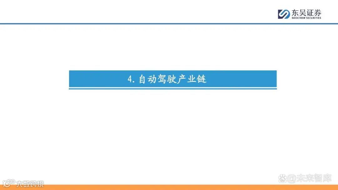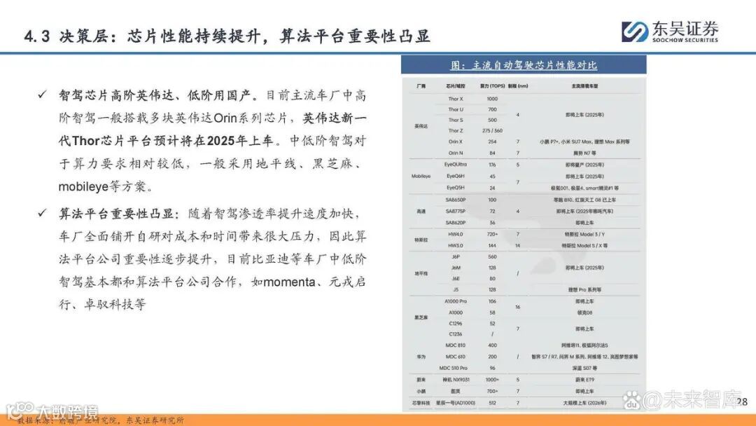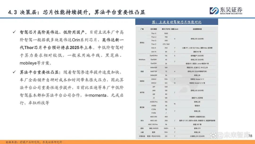 智驾芯片高阶英伟达、低阶用国产。目前主流车厂中高 阶智驾一般搭载多块英伟达Orin系列芯片,英伟达新一 代Thor芯片平台预计将在2025年上车。中低阶智驾对 于算力要求相对较低,一般采用地平线、黑芝麻、 mobileye等方案。算法平台重要性凸显:随着智驾渗透率提升速度加快, 车厂全面铺开自研对成本和时间带来很大压力,因此算 法平台公司重要性逐步提升,目前比亚迪等车厂中低阶 智驾基本都和算法平台公司合作,如momenta、元戎启 行、卓驭科技等。