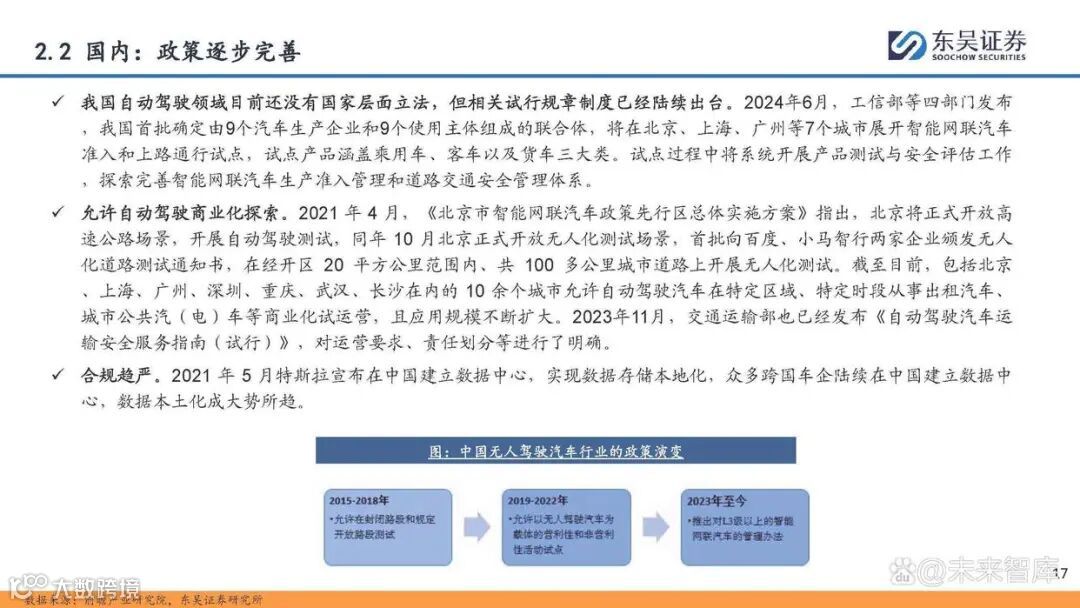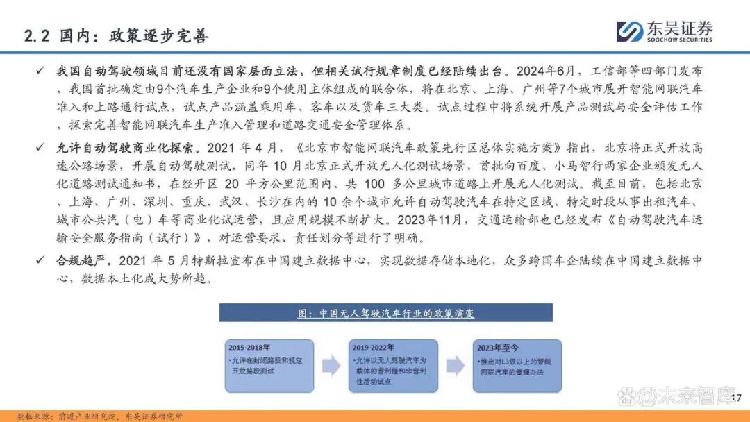 我国自动驾驶领域目前还没有国家层面立法,但相关试行规章制度已经陆续出台。2024年6月,工信部等四部门发布 ,我国首批确定由9个汽车生产企业和9个使用主体组成的联合体,将在北京、上海、广州等7个城市展开智能网联汽车 准入和上路通行试点,试点产品涵盖乘用车、客车以及货车三大类。试点过程中将系统开展产品测试与安全评估工作 ,探索完善智能网联汽车生产准入管理和道路交通安全管理体系。允许自动驾驶商业化探索。2021 年 4 月,《北京市智能网联汽车政策先行区总体实施方案》指出,北京将正式开放高 速公路场景,开展自动驾驶测试,同年 10 月北京正式开放无人化测试场景,首批向百度、小马智行两家企业颁发无人 化道路测试通知书,在经开区 20 平方公里范围内、共 100 多公里城市道路上开展无人化测试。截至目前,包括北京 、上海、广州、深圳、重庆、武汉、长沙在内的 10 余个城市允许自动驾驶汽车在特定区域、特定时段从事出租汽车、 城市公共汽(电)车等商业化试运营,且应用规模不断扩大。2023年11月,交通运输部也已经发布《自动驾驶汽车运 输安全服务指南(试行)》,对运营要求、责任划分等进行了明确。合规趋严。2021 年 5 月特斯拉宣布在中国建立数据中心,实现数据存储本地化,众多跨国车企陆续在中国建立数据中 心,数据本土化成大势所趋。