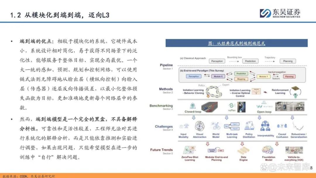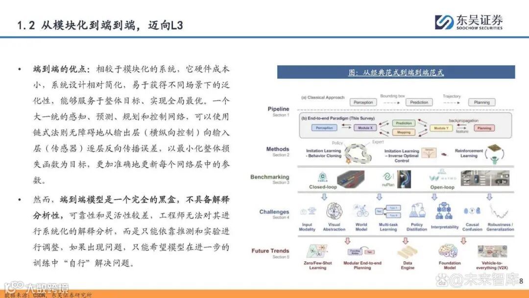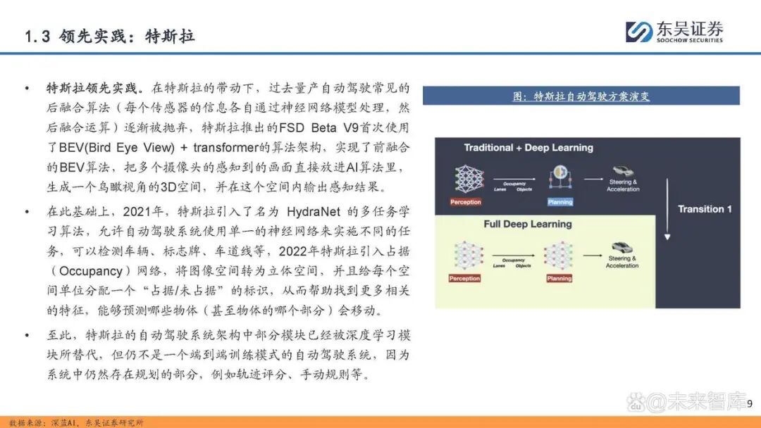 特斯拉领先实践。在特斯拉的带动下,过去量产自动驾驶常见的 后融合算法(每个传感器的信息各自通过神经网络模型处理,然 后融合运算)逐渐被抛弃,特斯拉推出的FSD Beta V9首次使用 了BEV(Bird Eye View) + transformer的算法架构,实现了前融合 的BEV算法,把多个摄像头的感知到的画面直接放进AI算法里, 生成一个鸟瞰视角的3D空间,并在这个空间内输出感知结果。在此基础上,2021年,特斯拉引入了名为 HydraNet 的多任务学 习算法,允许自动驾驶系统使用单一的神经网络来实施不同的任 务,可以检测车辆、标志牌、车道线等,2022年特斯拉引入占据 (Occupancy)网络,将图像空间转为立体空间,并且给每个空 间单位分配一个“占据/未占据”的标识,从而帮助找到更多相关 的特征,能够预测哪些物体(甚至物体的哪个部分)会移动。至此,特斯拉的自动驾驶系统架构中部分模块已经被深度学习模 块所替代,但仍不是一个端到端训练模式的自动驾驶系统,因为 系统中仍然存在规划的部分,例如轨迹评分、手动规则等。