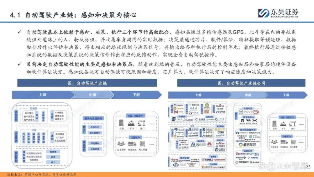 自动驾驶基本上依赖于感知、决策、执行三个环节的高效配合。感知层通过多维传感器及GPS、北斗等在内的导航系 统识别道路上的人、物及标识,并收集车身周围的实时数据;决策层通过芯片、软件/算法、特征提取等预处理,数据 融合后作出评估和决策,得出相应的路径规划与决策信号,并输出给各种执行层的控制单元;最终执行层通过接收感 知系统的数据及决策系统的决策信号作出相应的反馈动作,实现全套自动驾驶操作。目前决定自动驾驶性能的主要是感知和决策层。随着端到端的普及,自动驾驶性能主要由感知层和决策层的硬件设备 和软件算法决定。感知设备决定自动驾驶可视范围和精度,芯片算力、软件算法决定了响应速度和决策能力。