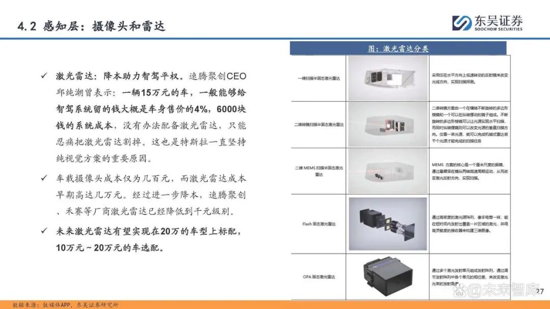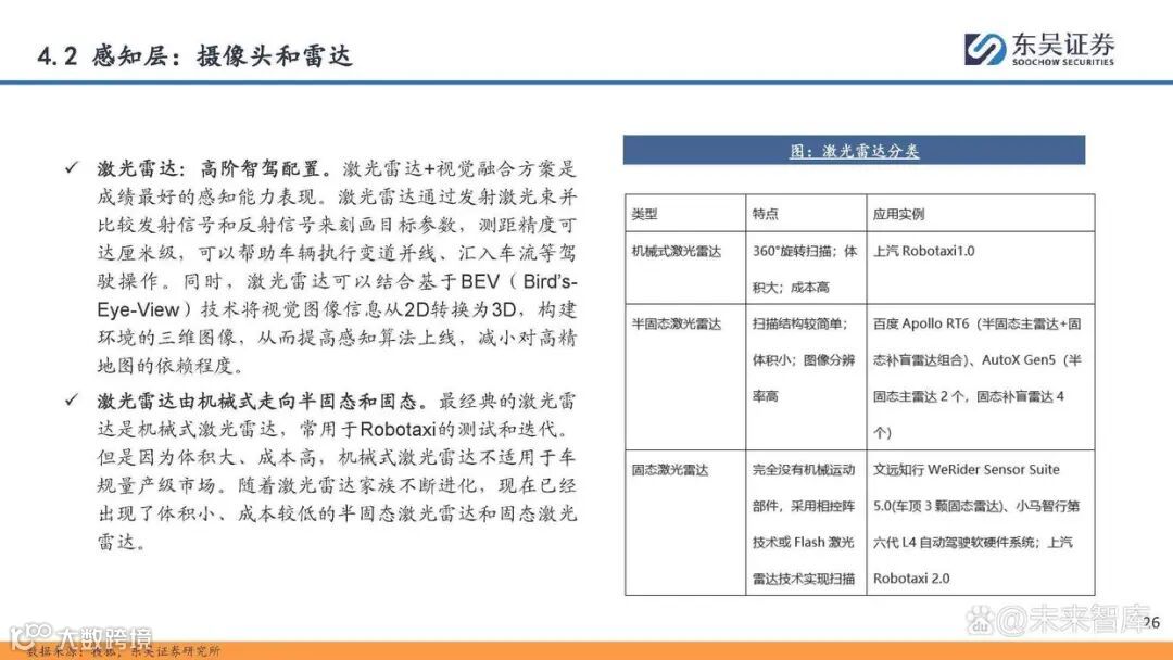 激光雷达:高阶智驾配置。激光雷达+视觉融合方案是 成绩最好的感知能力表现。激光雷达通过发射激光束并 比较发射信号和反射信号来刻画目标参数,测距精度可 达厘米级,可以帮助车辆执行变道并线、汇入车流等驾 驶操作。同时,激光雷达可以结合基于BEV(Bird’sEye-View)技术将视觉图像信息从2D转换为3D,构建 环境的三维图像,从而提高感知算法上线,减小对高精 地图的依赖程度。激光雷达由机械式走向半固态和固态。最经典的激光雷 达是机械式激光雷达,常用于Robotaxi的测试和迭代。但是因为体积大、成本高,机械式激光雷达不适用于车 规量产级市场。随着激光雷达家族不断进化,现在已经 出现了体积小、成本较低的半固态激光雷达和固态激光 雷达。