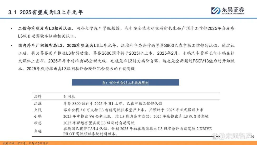 工信部有望发布L3相关认证。同济大学汽车学院教授、汽车安全技术研究所所长朱西产预计工信部2025年会发布 L3级自动驾驶车辆的相关认证。国内外车厂积极布局L3,2025有望成为L3上车元年。江淮和华为合作的尊界S800已在申报工信部的认证,通过认 证后,将为尊界用户推送L3智驾功能,尊界S800预计将于2025H1上市。2025年2月,小鹏汽车董事长何小鹏在社 交媒体上宣布,2025年年中将推出V6全新大版,也就是准L3能力高阶自驾,这也是全面超过FSDV13能力的开始版 本。2025年底将推出真L3级别软件和硬件冗余能力的自动驾驶。