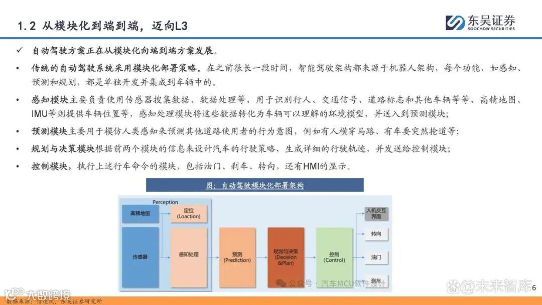 自动驾驶方案正在从模块化向端到端方案发展。传统的自动驾驶系统采用模块化部署策略。在之前很长一段时间,智能驾驶架构都来源于机器人架构,每个功能,如感知、 预测和规划,都是单独开发并集成到车辆中的。感知模块主要负责使用传感器搜集数据、数据处理等,用于识别行人、交通信号、道路标志和其他车辆等等,高精地图、 IMU等则提供车辆位置等,感知处理模块将这些数据转化为车辆可以理解的环境模型,并送入到预测模块;预测模块主要用于模仿人类感知来预测其他道路使用者的行为意图,例如有人横穿马路、有车要突然抢道等;规划与决策模块根据前两个模块的信息来设计汽车的行驶策略,生成详细的行驶轨迹,并发送给控制模块;控制模块,执行上述行车命令的模块,包括油门、刹车、转向,还有HMI的显示。