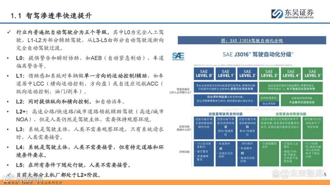 行业内普遍把自动驾驶分为五个等级。其中L0为完全人工驾 驶,L1-L2为部分辅助驾驶,从L3-L5由部分自动驾驶逐渐向 完全自动驾驶过渡。L0:提供警告和瞬时协助,如AEB(自动紧急制动)、车道 偏离警告等。L1:借助感知系统对车辆做单一方向的运动控制/辅助,如车 道居中LCC(横向运动控制,方向盘)或自适应巡航ACC( 纵向运动控制,油门/刹车)。L2:同时提供纵向和横向控制。如自动泊车。L2+:高速公路/快速路/城市道路领航辅助驾驶(高速/城市 NOA),但是人类仍然是驾驶主体,需要保持观察环境。L3:系统是驾驶主体,人类不需要观察环境,只有系统请求 时,人类需要接管。L4:系统是驾驶主体,人类不需要接管,但有特定道路和环 境条件要求。L5:在所有条件下随处行驶,人类不需要接管。目前大部分主机厂都处于L2+阶段。