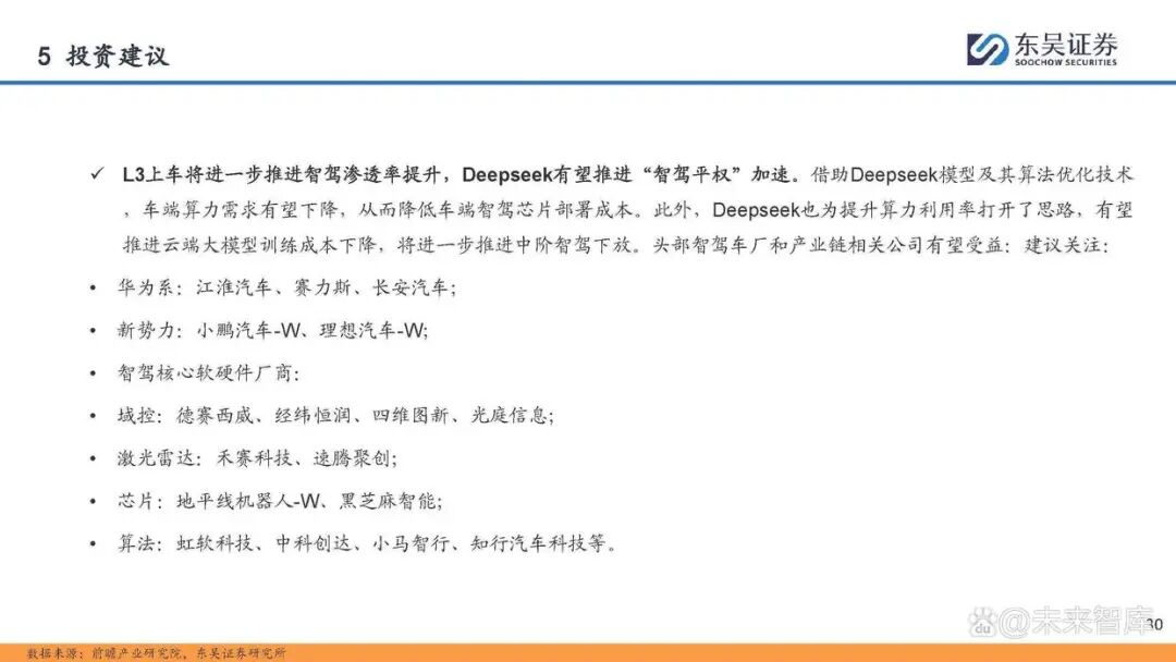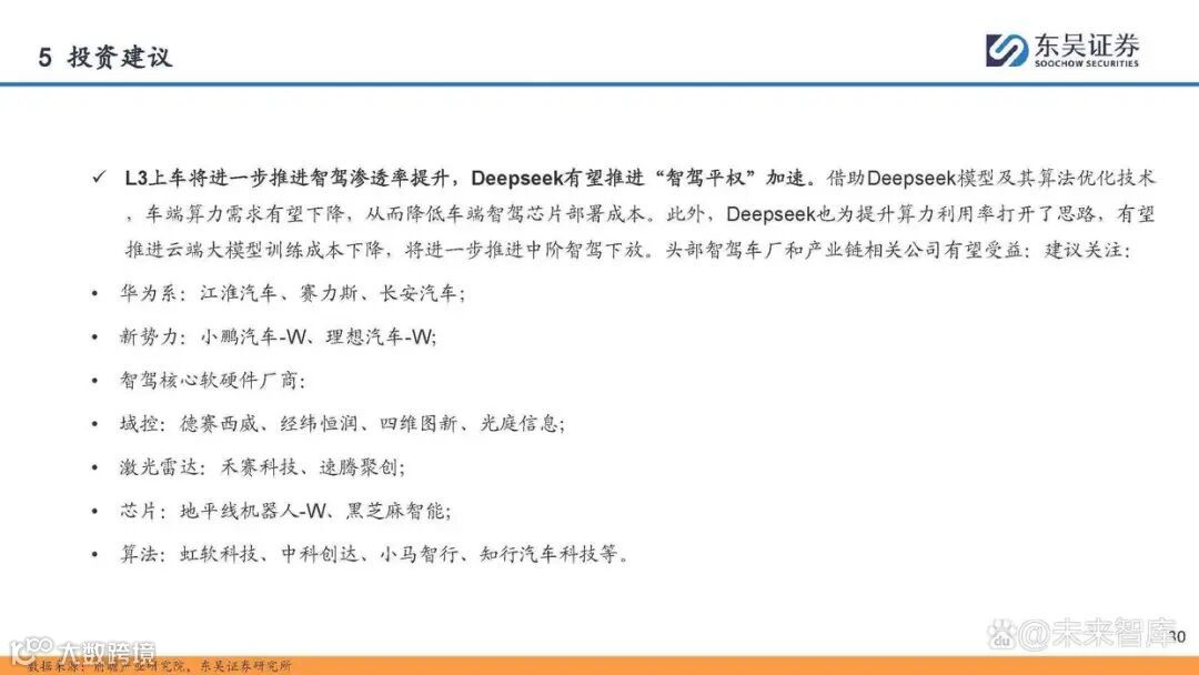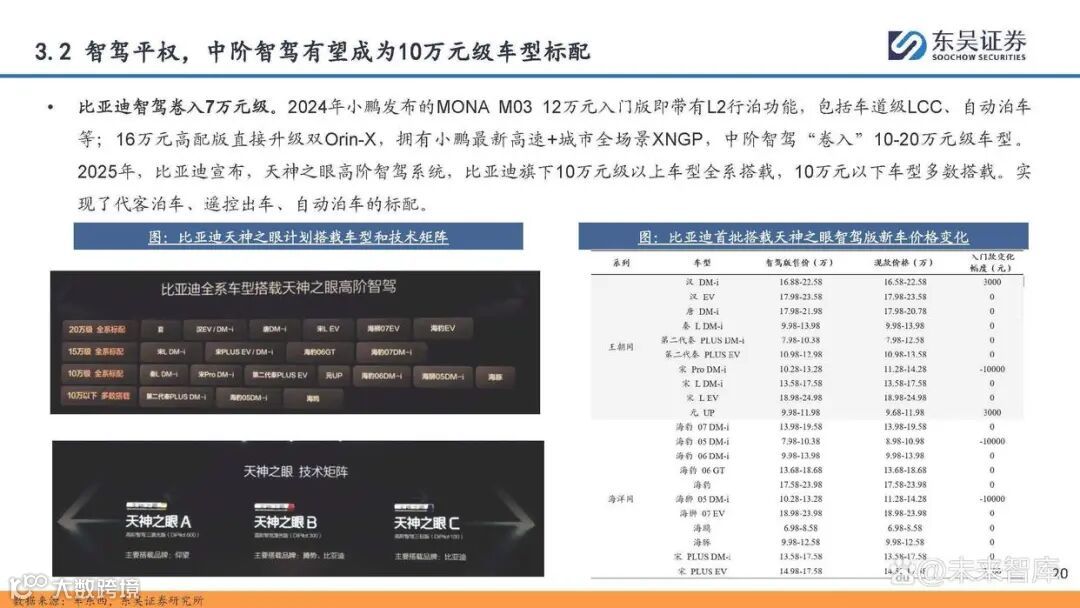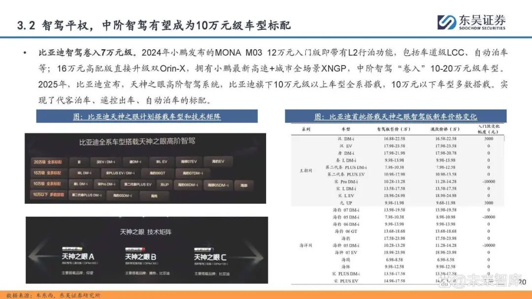 比亚迪智驾卷入7万元级。2024年小鹏发布的MONA M03 12万元入门版即带有L2行泊功能,包括车道级LCC、自动泊车 等;16万元高配版直接升级双Orin-X,拥有小鹏最新高速+城市全场景XNGP,中阶智驾“卷入”10-20万元级车型。2025年,比亚迪宣布,天神之眼高阶智驾系统,比亚迪旗下10万元级以上车型全系搭载,10万元以下车型多数搭载。实 现了代客泊车、遥控出车、自动泊车的标配。