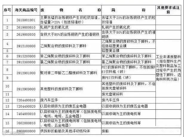一、将废五金、废船、废汽车压件、冶炼渣、工业来源废塑料等16种固体废物调整为禁止进口,自2018年12月31日起执行;