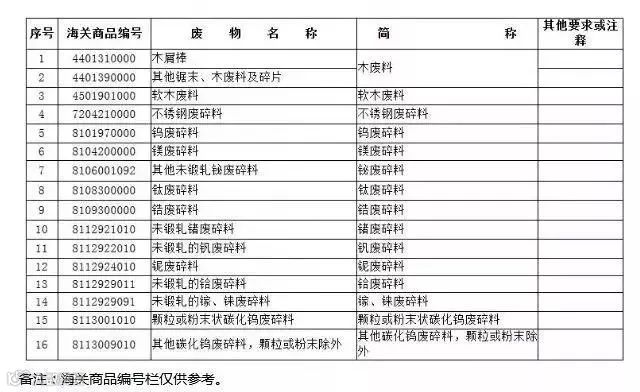 二、将不锈钢废碎料、钛废碎料、木废碎料等16个品种固体废物(见附件2),从《限制进口类可用作原料的固体废物目录》《非限制进口类可用作原料的固体废物目录》调入《禁止进口固体废物目录》,自2019年12月31日起执行。