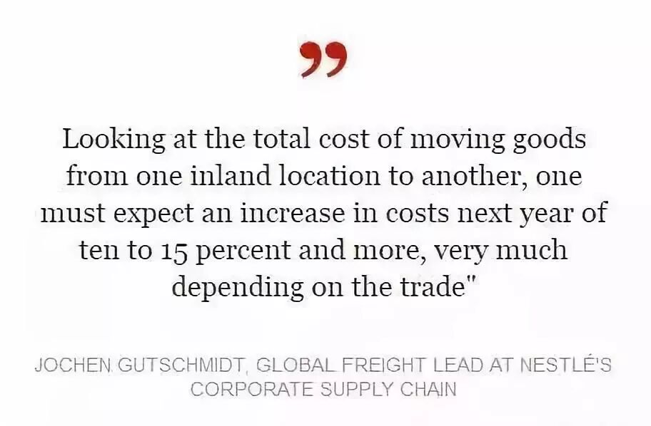 雀巢全球供应链货运主管Jochen Gutschmidt解释说:“虽然年度成本增加正常估计范围在3%或4%,但在某些行业,明年可能会增加10%到15%,所有运输包括海洋运输,端到端的流程其他成本要素的增加。”