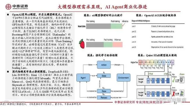 OpenAI发布o1模型,开启大模型新范式。OpenAI 于24年9月推出全新o1系列AI模型,复杂推理能力 显著增强,在一系列高难基准测试中表现相比 GPT-4o提升明显,特别在数学、编码和科学方面。o1模型技术关键在于强化学习(RL)的搜索和学 习机制,基于LLM已有推理能力,迭代式的 Bootstrap模型产生合理推理过程(Rationales)的 能力并融入到训练过程中,进而让模型学会推理, 运用足够强大的计算量实现后训练(Post-Training) 阶段的扩展。o1模型通过内置思维链(CoT)逐步 解决问题的方式一定程度上模拟了人类慢思考过程, AI进入L2"推理者"阶段,有望加速向AGI迈进,同 时模型性能随着强化学习时间(训练时计算量)和 推理时间(测试时计算量)的增加而显著提高,不 同于传统的大规模预训练方式(通过增加参数量和 数据量),具有独特的扩展性优势,带来新的 Scaling Law。
