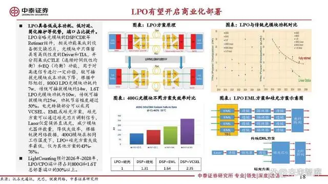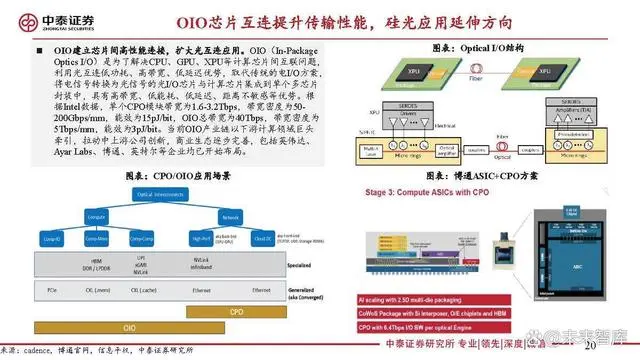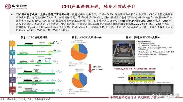 CPO创新封装技术,光模块器件厂商迎新机遇。随着光模块速率迭代,交换机SerDes传输速率和功耗或成为瓶颈,CPO方案将光模块集 成为光引擎,与交换ASIC芯片封装,缩短传输距离,降低链路损耗和功耗,Cisco数据显示基于CPO的交换机系统整体功耗较传统可插 拔方案降低25%-30%。CPO目前包括基于硅光和VCSEL两种方案,其中硅光为主流平台。Yole预计CPO将于2027-2029年试产,2029年 进入量产阶段,AI芯片迭代有望加速CPO产业进程。英伟达预计2025Q3量产首款CPO版本IB交换机Quantum 3400 X800,2026年推出 CPO版本的Spectrum4 Ultra X800以太网交换机。博通已推出第一代25.6T CPO交换机,第二代51.2T正在认证升级,并在今年各展会上成 功演示AI ASIC+CPO功能,即CPO+2.5D封装。