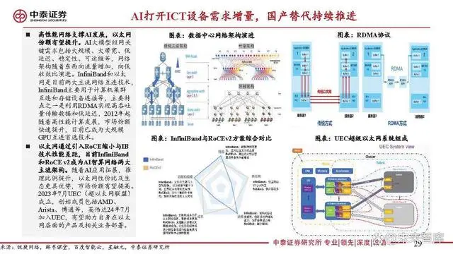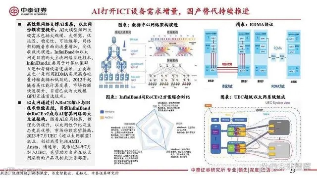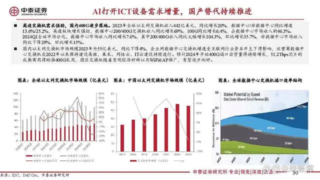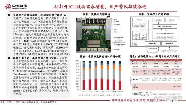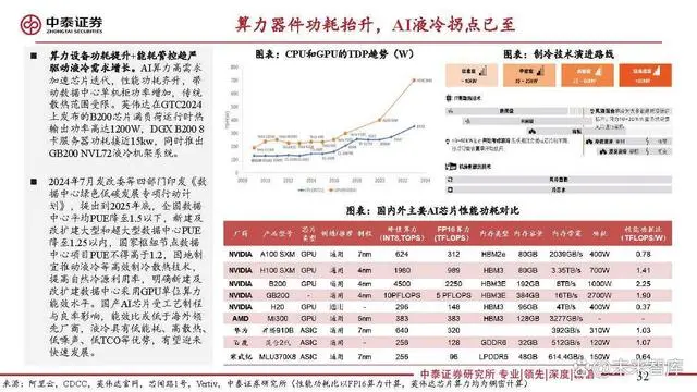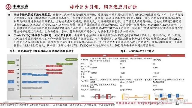 英伟达等拓展AI数据中心铜缆应用。英伟达在GTC2024上发布GB200 NVL72,机柜内部采用铜缆连接GPU和NVSwitch,共使用5000根, 累计长度近2英里,采用液冷设计,降低25倍成本和功耗。博通在24年3月投资者会议上表示考虑光学器件通常耗费较大的电力和成本, 以及故障率对集群运行影响,公司正在交换机及许多技术中扩大铜缆覆盖范围,目前铜的触及范围已达到4米,是标准要求的2倍,计划 机架内部全部采用铜缆连接并通过PCIe或直接连接的铜缆实现互连,将围绕尽可能多使用铜互连以及降低非铜缆链路功耗成本两大目标 升级Serdes。Marvell在AI Day上表示将开拓基于DSP的AEC全新市场,以改善铜缆传输损耗。