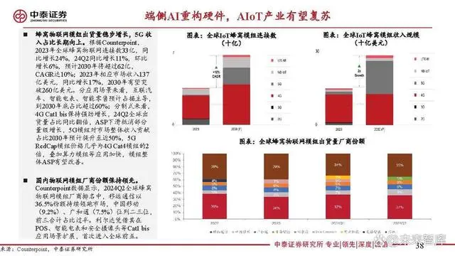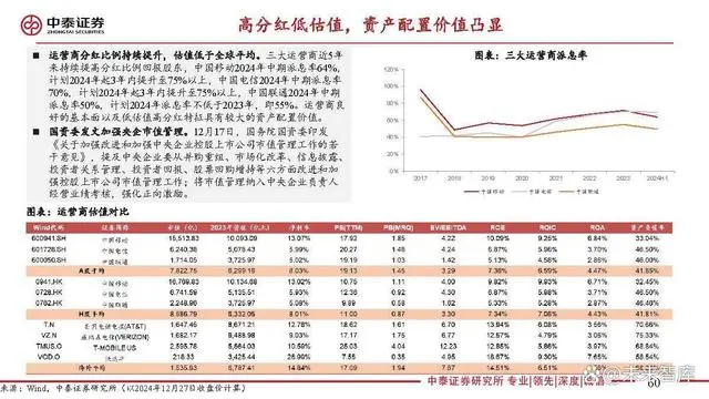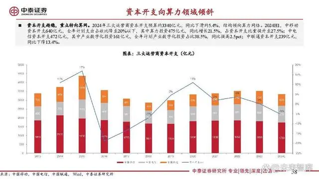 固网业务收入增速稳定,ARPU整体回升。2024H1,1)中国移动:家庭市场收入698亿元,同比增长7.5%,家庭客户综合ARPU 43.4元, 同比提升0.2%;2)中国电信:固网及智慧家庭收入640亿元,同比 增长3.2%;宽带综合ARPU 48.3元,同比提高0.2%。3)中国联通:截至2024H1末千兆宽带用户渗透率25%,融合用户(移动+固网) ARPU 103元。