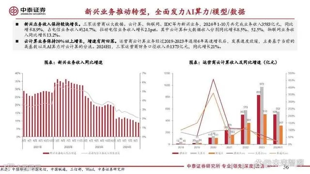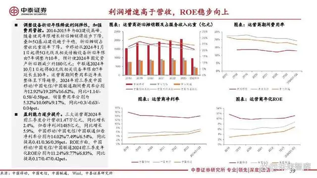 移动数据流量业务收入小幅下滑。根据工信部,2024年1-10月电信业务收入1.45万亿元,同比增长2.6%,其中固网宽带收入同比+4.3%, 移动数据流量业务收入同比-1.3%。量价拆分来看,2024年1-10月,移动互联网累计流量达2766亿GB,同比增长12.3%,增速同比回落 2.5pct,10月当月DOU达到19.2GB/户·月,同比增长7.6%。截至10月末,5G移动电话用户9.95亿户,较上年末净增1.73亿户,占比55.6%, 较上年末提高9pct。测算得单GB价格约1.93元,同比下降12.6%,延续持续下降趋势,降幅趋于稳定。