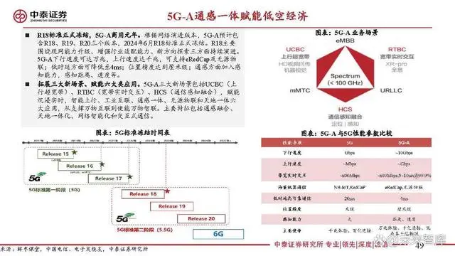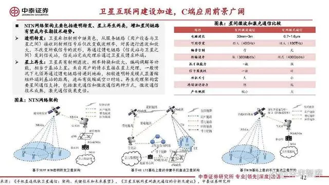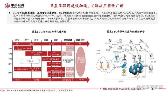 3GPP NTN标准演进,星地通信深度融合。3GPP NTN标准从2017年R15开始启动,一直在朝着将卫星纳入 3GPP 技术规范的目标前进着, 这一目标将持续到R20的6G标准工作中。其中,非地面网络(Non-Terrestrial Network, NTN)被广泛认为是6G 网络的组成部分。6G通信架 构包括低轨卫星及5G网络融合。6G由天基平台、空基平台和地面平台组成,由此实现对5G无法触及的陆地与海洋、天空实现全域覆盖, 构成一个地面无线与卫星通信融合集成的全连接世界。