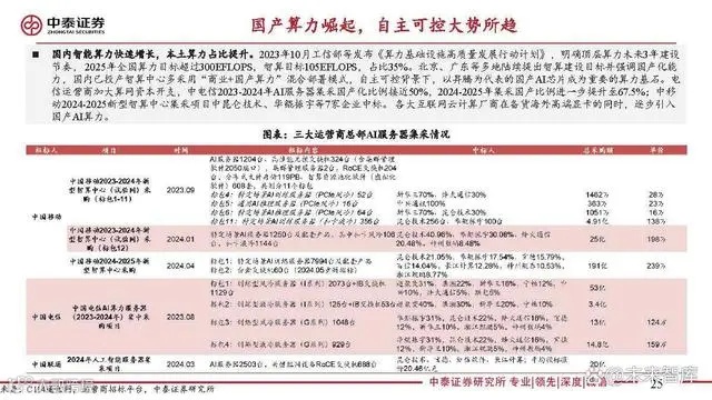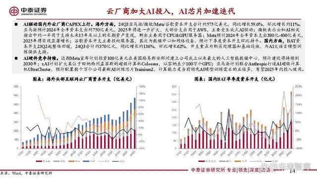 AI驱动国内外云厂商CAPEX上行。海外方面,24Q3亚马逊/微软/Meta/谷歌资本开支合计约575亿美元,同比增长59.6%,环比增长约11%。亚马逊预计2024年全年资本支出约750亿美元,2025年将进一步扩大,大部分支出用于AWS,主要受生成式AI驱动;微软表示云和AI相关 指出中约一半用于支持未来15年及以上的长期资产变现,剩余主要用于CPU&GPU服务器;Meta预计2024年全年资本支出380亿-400亿美元, 2025年将实现显著增长;谷歌资本开支主要投向服务器,其次为数据中心和网络设备,预计下季度资本开支环比持平。国内方面,BAT资 本开支23Q2起整体回暖,24Q3合计约370亿元,同比增长约136%,环比增长62%,开支重点为购买处理器和基础设施,为AI大语言模型训 练提供支持。