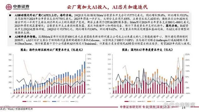 AI硬件竞争持续。近期Meta宣布计划投资100亿美元在美国路易斯安那州建立公司成立以来最大的人工智能数据中心,预计建设将持续到 2030年;xAI计划扩大其位于田纳西州孟菲斯的超级计算机Colossus,以容纳至少100万个GPU;亚马逊计划联合Anthropic打造AI超级计算 机UltraCluster,预计配置数十万个公司最新AI训练芯片Trainium2,计算能力是当前领先AI模型训练需求的五倍多,有望2025年内投入使用。