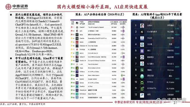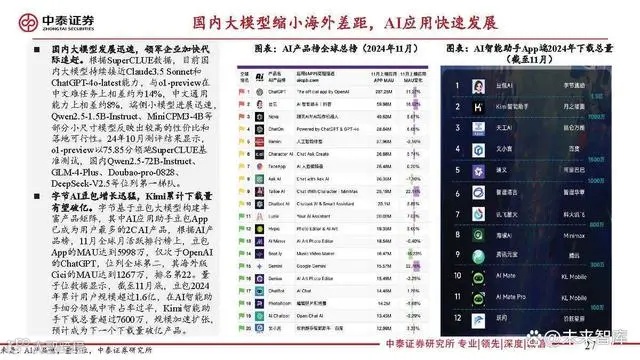 字节AI豆包增长迅猛,Kimi累计下载量 有望破亿。字节基于豆包大模型构建丰 富产品矩阵,其中AI应用助手豆包App 已成为用户最多的2C AI产品,根据AI产 品榜,11月全球月活跃排行榜上,豆包 App的MAU达到5998万,仅次于OpenAI 的ChatGPT,位列全球第二,其海外版 Cici的MAU达到1267万,排名第22。量 子位数据显示,截至11月底,豆包2024 年累计用户规模超过1.6亿,在AI智能助 手细分领域中市占率过半,Kimi智能助 手下载总量超过7600万,规模加速扩张, 预计成为下一个下载量破亿产品。
