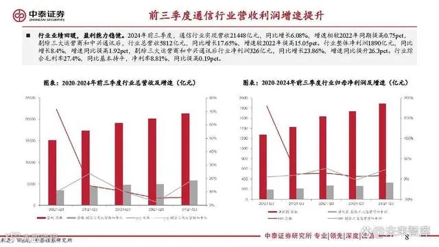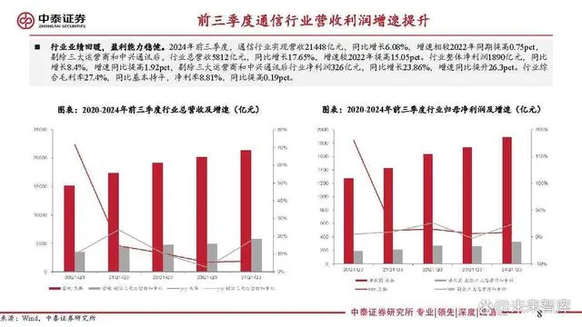 行业业绩回暖,盈利能力稳健。2024年前三季度,通信行业实现营收21448亿元,同比增长6.08%,增速相较2022年同期提高0.75pct, 剔除三大运营商和中兴通讯后,行业总营收5812亿元,同比增长17.65%,增速较2022年提高15.05pct。行业整体净利润1890亿元,同比 增长8.4%,增速同比提高1.92pct,剔除三大运营商和中兴通讯后行业净利润326亿元,同比增长23.86%,增速同比提升26.3pct。行业综合毛利率27.4%,同比基本持平,净利率8.81%,同比提高0.19pct。