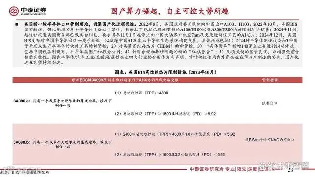 美国新一轮半导体出口管制落地,倒逼国产化进程提速。2022年8月,美国政府要求限制向中国出口A100、H100;2023年10月,美国BIS 发布新规,强化高端芯片和半导体设备出口禁令,新条款下包括已经被限制的A100/H100以及A800/H800均被限制对华销售;2024年11月, 路透社报道美国商务部已致函台积电,要求其从11月1日起停止向中国大陆客户供应7nm及更先进制程工艺的AI芯片;2024年12月,美国 BIS发布对中国半导体出口一揽子新规,以减缓中国AI及本土半导体生态系统构建发展,具体措施包括1)对24种半导体制造设备和3种用 于开发或生产半导体的软件工具的新管控;2)对高带宽内存芯片(HBM)的新管控;3)“实体清单”新增140家企业并进行14项修改, 包括中国设备制造商、半导体晶圆厂和投资公司;4)针对合规和转移问题的新的“红旗警告”;5)几项关键的监管变化,以增强先前管 制的有效性。国内半导体/汽车工业/互联网/通信企业四大行业协会集体发布声明,呼吁积极使用内外资企业在华生产制造的芯片,国产化 进程有望持续加速。