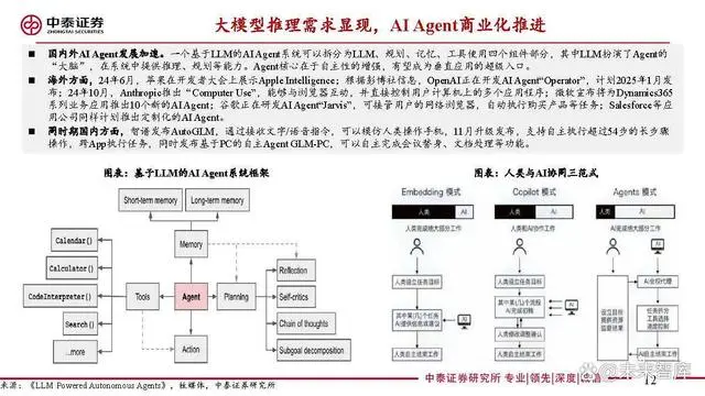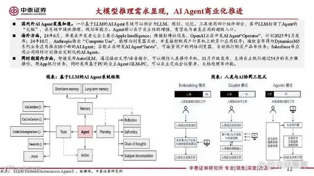 海外方面,24年6月,苹果在开发者大会上展示Apple Intelligence;根据彭博社信息,OpenAI正在开发AI Agent“Operator”,计划2025年1月发 布;24年10月,Anthropic推出“Computer Use”,能够与浏览器互动,并直接控制用户计算机上的多个应用程序;微软宣布将为Dynamics365 系列业务应用推出10个新的AI Agent;谷歌正在研发AI Agent“Jarvis”,可接管用户的网络浏览器,自动执行购买产品等任务;Salesforce等应 用公司同样计划推出定制化的AI Agent。