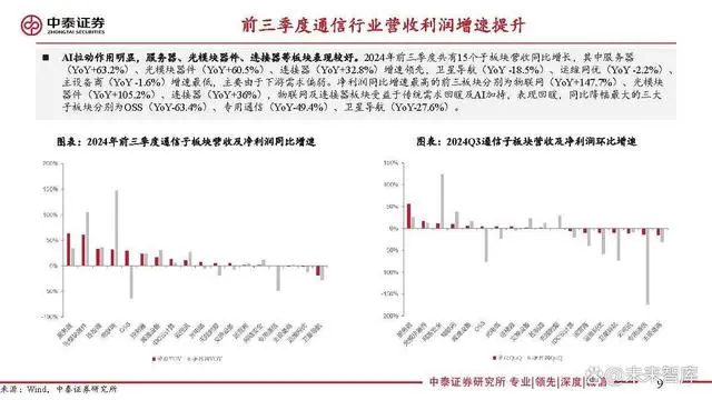 AI拉动作用明显,服务器、光模块器件、连接器等板块表现较好。2024年前三季度共有15个子板块营收同比增长,其中服务器 (YoY+63.2%)、光模块器件(YoY+60.5%)、连接器(YoY+32.8%)增速领先,卫星导航(YoY -18.5%)、运维网优(YoY -2.2%)、 主设备商(YoY -1.6%)增速最低,主要由于下游需求偏弱。净利润同比增速最高的前三板块分别为物联网(YoY+147.7%)、光模块 器件(YoY+105.2%)、连接器(YoY+36%),物联网及连接器板块受益于传统需求回暖及AI加持,表现回暖,同比降幅最大的三大 子板块分别为OSS(YoY-63.4%)、专用通信(YoY-49.4%)、卫星导航(YoY-27.6%)。
