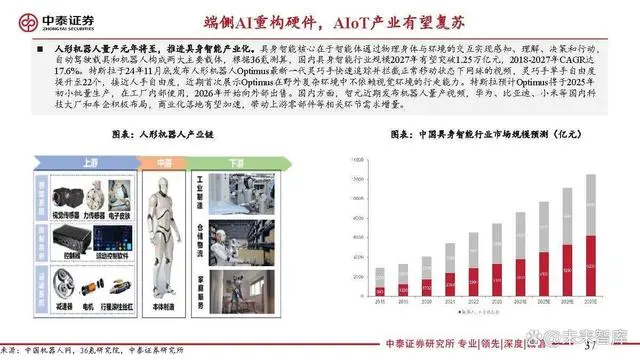 人形机器人量产元年将至,推进具身智能产业化。具身智能核心在于智能体通过物理身体与环境的交互实现感知、理解、决策和行动, 自动驾驶载具和机器人构成两大主要载体,根据36氪测算,国内具身智能行业规模2027年有望突破1.25万亿元,2018-2027年CAGR达 17.6%。特斯拉于24年11月底发布人形机器人Optimus最新一代灵巧手快速追踪并拦截正常移动状态下网球的视频,灵巧手单手自由度 提升至22个,接近人手自由度,近期首次展示Optimus在野外复杂环境中不依赖视觉环境的行走能力。特斯拉预计Optimus将于2025年 初小批量生产,在工厂内部使用,2026年开始向外部出售。国内方面,智元近期发布机器人量产视频,华为、比亚迪、小米等国内科 技大厂和车企积极布局,商业化落地有望加速,带动上游零部件等相关环节需求增量。