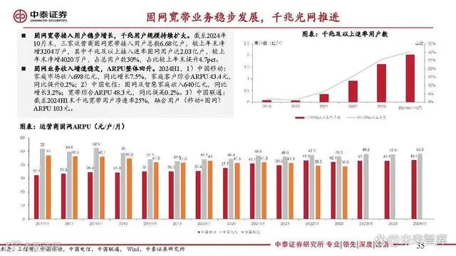 固网宽带接入用户稳步增长,千兆用户规模持续扩大。截至2024年 10月末,三家运营商固网宽带接入用户总数6.68亿户,较上年末净 增3204万户,其中千兆及以上接入速率固网用户达2.03亿户,较上 年末净增4020万户,占总用户数30%,占比较上年末提升4.7pct。