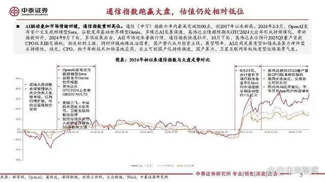 AI驱动叠加市场情绪回暖,通信指数重回高位。通信(申万)指数今年内最高突破3100点,创2017年以来新高。2024年2-3月,OpenAI发 布首个文生视频模型Sora,谷歌发布基础世界模型Genie,多模态AI发展提速,英伟达业绩超预期及GTC2024大会等形成持续催化,带动 指数回升,2024年9月下旬,多项政策出台,A股市场迎来普涨行情,通信指数快速拉升,10月下旬,英伟达表示预计2025Q3量产首款 CPO版本IB交换机,相关标的上涨,同时伴随地缘政治因素,国产替代成为投资主线。展望明年,AI应用发展有望加强底层算力硬件需 求持续性,硅光、CPO、相干等新技术加快落地应用,自主可控国产化持续推进,国产算力、卫星互联网等板块有望延续高景气度。