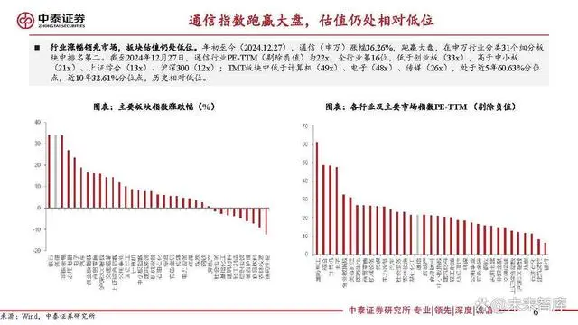 行业涨幅领先市场,板块估值仍处低位。年初至今(2024.12.27),通信(申万)涨幅36.26%,跑赢大盘,在申万行业分类31个细分板 块中排名第二。截至2024年12月27日,通信行业PE-TTM(剔除负值)为22x,全行业第16位,低于创业板(33x),高于中小板 (21x)、上证综合(13x)、沪深300(12x);TMT板块中低于计算机(49x)、电子(48x)、传媒(26x),处于近5年60.63%分位 点,近10年32.61%分位点,历史相对低位。